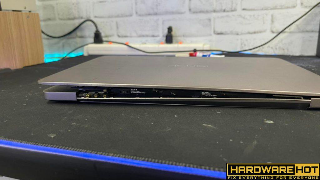 โน๊ตบุ๊คได้มีการออกแบบให้เบาบาง พกพาสะดวกน้ำหนักเบาแต่ก็ต้องแลกมาด้วยความเปราะบางของบอดี้ พอเราใช้งานไปนานๆ บานพับจอเริ่มฝืดสาเหตุอาจจะมาจากฝุ่นหรือสนิมพอเราปิดเปิดฝาจอบ่อยๆจึงทำให้บอดี้เริ้มมีการแตกร้าว