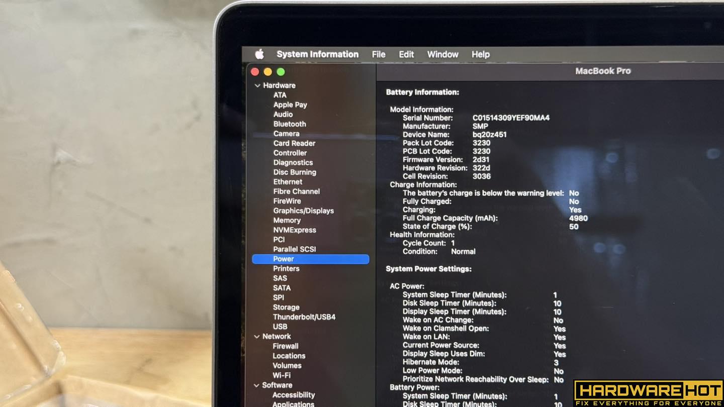 วิธีตรวจสอบก็คือไปที่ สัญลักษณ์ Apple ด้านซ้ายบน แล้วเลือก System report แล้วมาที่หมวด Hardware > Power